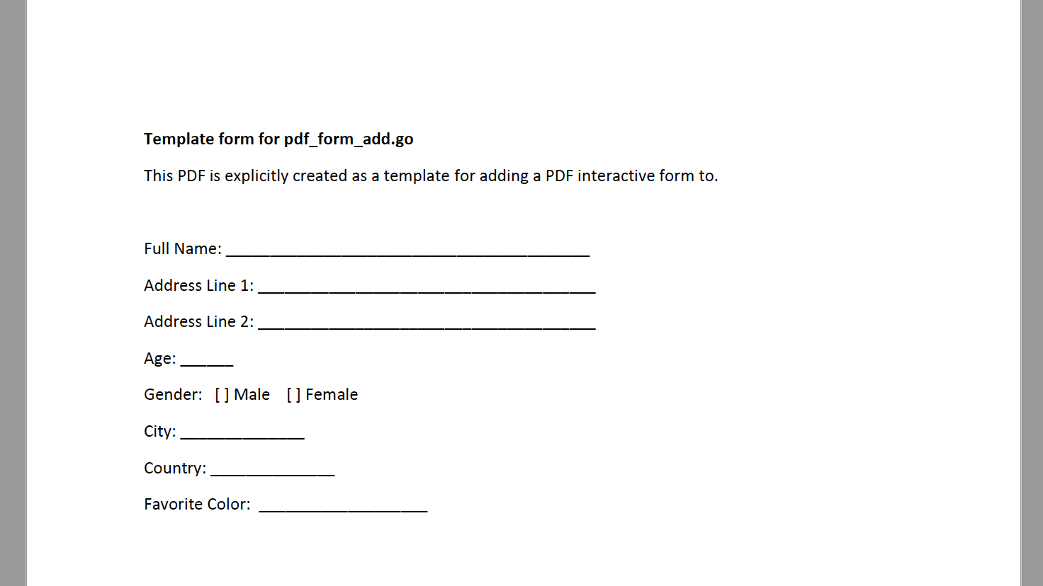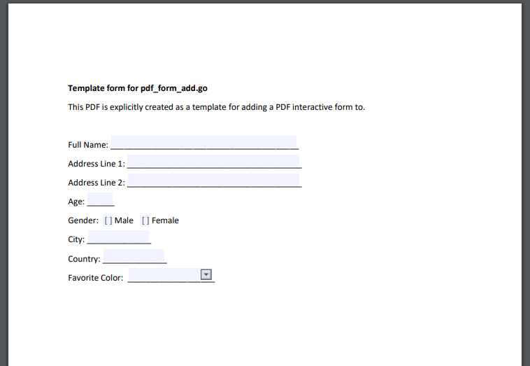 To convert this into a fillable PDF form, we need to add some data to the PDF which indicates what fields are in the document, and where they are (i.e. in PDF space coordinates). We just need to define the coordinates of the rectangles where the input field should be present and then let the annotator package of UniPDF take care of building the fields on your PDF document.