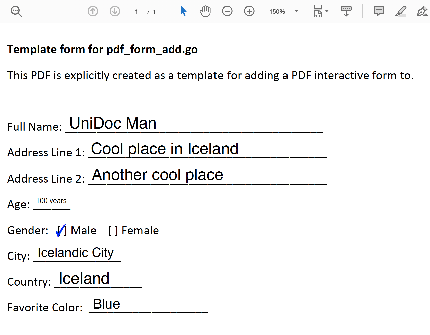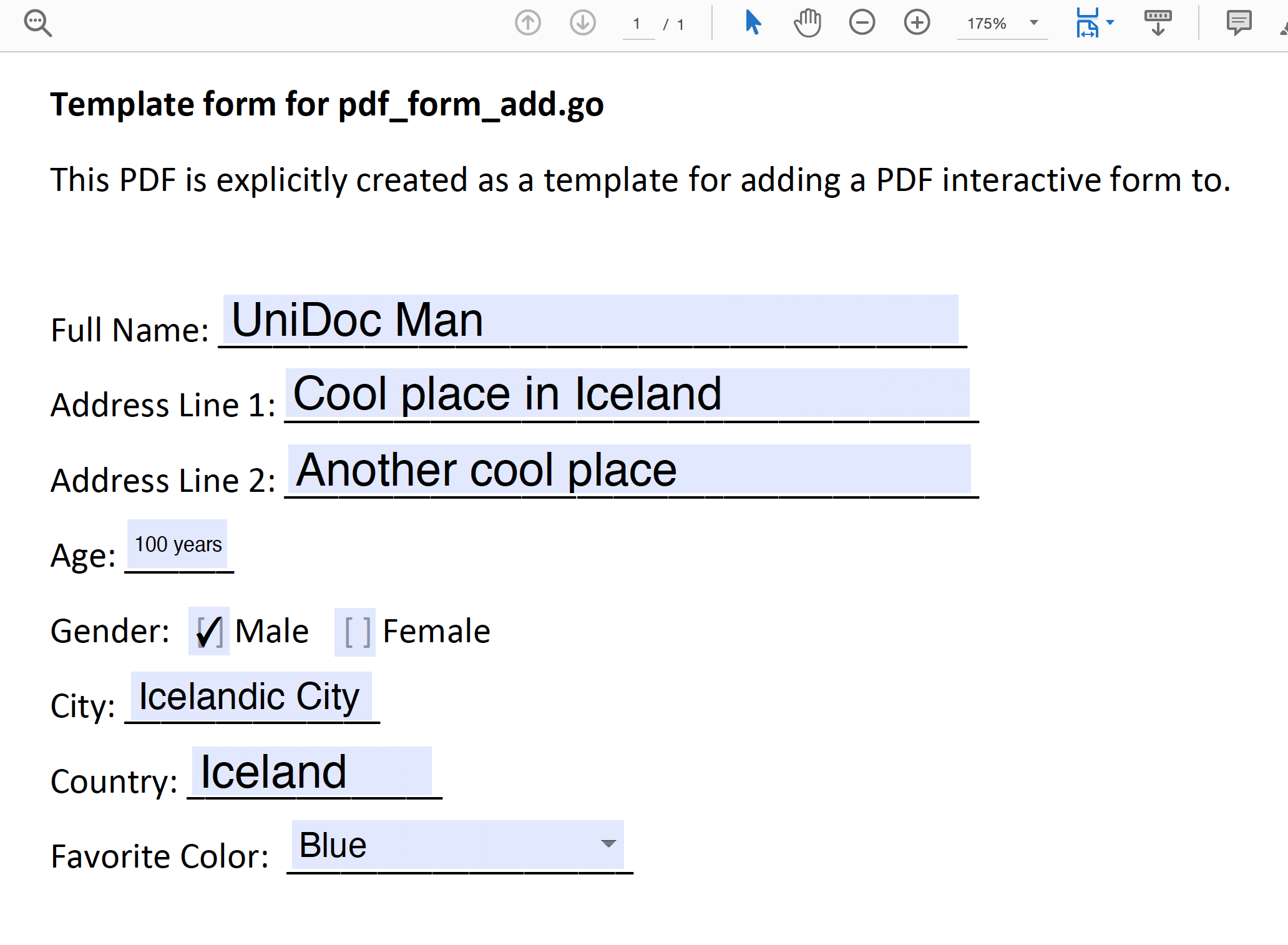and the output PDF file can be seen in Figure 2 below. The full code snippet follows with a Playground example that can be modified and run in our playground. It can be seen that the fields now have inputs where values can be inserted in the Viewer.